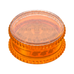 Młynek ma pomarańczowy kolor. Posiada także na wieczku logo firmy Storz&Bickel.